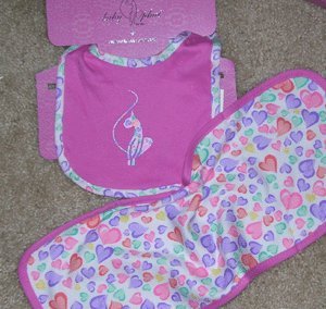 100% Cotton SetBib has velcro tab at back neck. 7" x 6". Pink with heart print binding and cat logo silkscreen on one sideBurp cloth measures 17" x 6". White with mulit colored hearts and finished with pink binding.Machine washable.