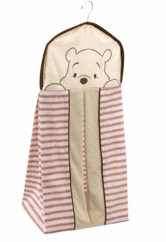 Accent your Hundred Acre Wood-themed nursery and keep organized with the Pooh Bear Diaper Stacker from Kids Line. Crafted from 100% cotton, this stacker features a red and cream striped theme, fleece trim and a friendly peek-a-boo Pooh embroidery. It has a top hanger and a structured base for stability, and coordinates perfectly with the Pooh Bear nursery collection. Dimensions: 25"H x 11.75"W x 9"D.