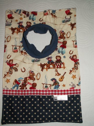 M is for milk bib. Rodeo scene on a Cream background, with a coordinating navy blue stars fabric, and red gingham ribbon.