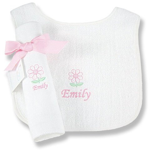 Our Dainty Daisy personalized bib & burp cloth set is custom embroidered with baby’s name and features our adorable daisy flower design. A perfect accessory for meal time and a much appreciated gift set! Made of 100% cotton by Baby Stuff® A complimentary gift card, printed with your personal message, may be requested during check-out. *Gift Box Available