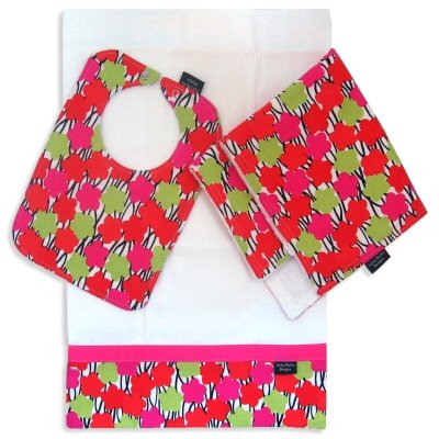 This bib, burp cloth and cuddle blanket set features a fun, modern flower print. The 100% cotton bib reverses to a colorful coordinating print, is lined with cotton batting and features a snap closure. The burp cloth is a 100% cotton cloth diaper enhanced with the print and ribbon trim on both the front and back. The cuddle blanket reverses to decadently soft minkee dot fabric and is sized at 17" square - perfect for tiny hands. All are machine wash and dry. Handcrafted in the USA by moms for moms.
